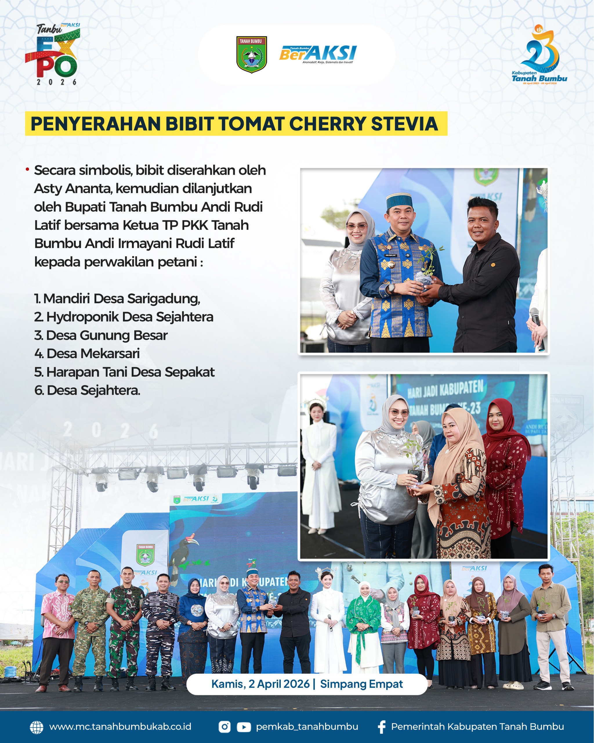 CBN Tanah Bumbu — Dalam rangka memeriahkan Hari Ulang Tahun ke-23 Kabupaten Tanah Bumbu, Bupati Andi Rudi Latif bersama artis nasional Asty Ananta menyerahkan bibit Tomat Cherry Stevia kepada petani lokal. Penyerahan dilakukan secara simbolis pada pembukaan Aksi Inovasi Tanbu 2026, yang berlangsung di Ruang Terbuka Publik (samping KFC), Simpang Empat, Kamis (2/4/2026).