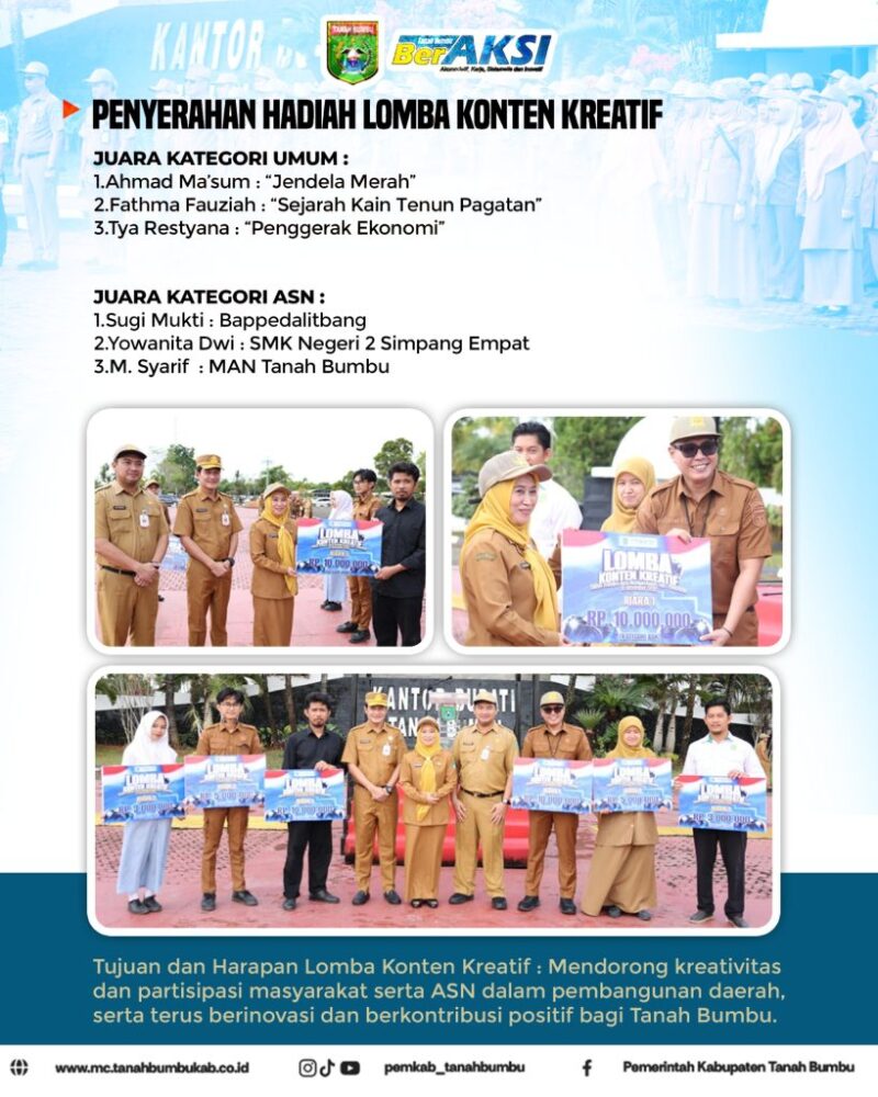 Penyerahan hadiah kepada para pemenang dilakukan langsung oleh Sekretaris Daerah Kabupaten Tanah Bumbu, Yulian Herawati, di hadapan seluruh peserta apel. Kegiatan ini diharapkan dapat memotivasi pegawai dan masyarakat untuk terus berinovasi serta berkontribusi positif bagi daerah. (Fan)