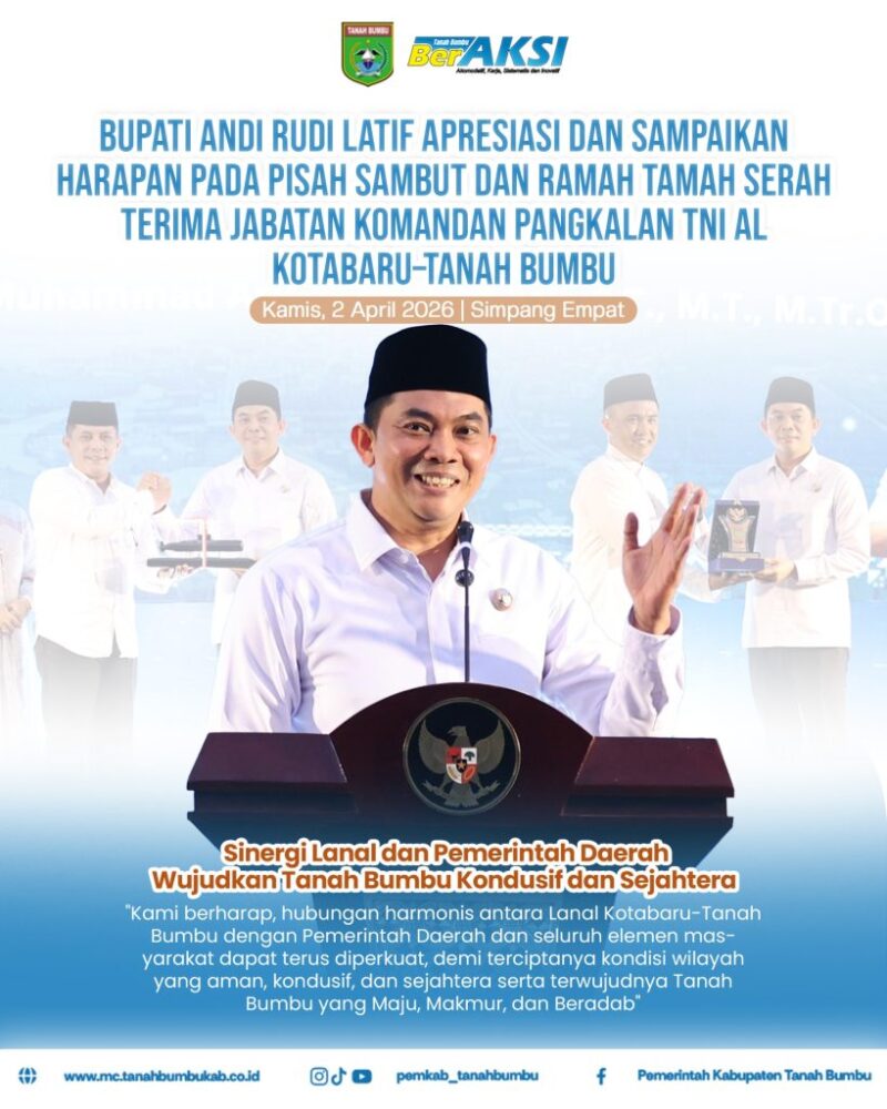 Bupati Tanah Bumbu, Andi Rudi Latif, menyampaikan ucapan terima kasih dan penghargaan setinggi-tingginya kepada Letkol Laut (P) M. Harun Al Rasyid, S.T., M.Tr.Opsla, atas dedikasi, pengabdian, serta kontribusi yang telah diberikan selama bertugas di wilayah Kotabaru-Tanah Bumbu.
