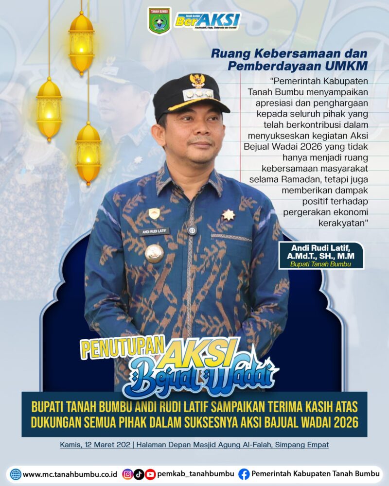 “Atas nama Pemerintah Kabupaten Tanah Bumbu, saya menyampaikan apresiasi dan penghargaan kepada seluruh pihak yang telah berkontribusi dalam menyukseskan kegiatan Aksi Bejual Wadai pada bulan Ramadan tahun ini,” ujar Bupati.