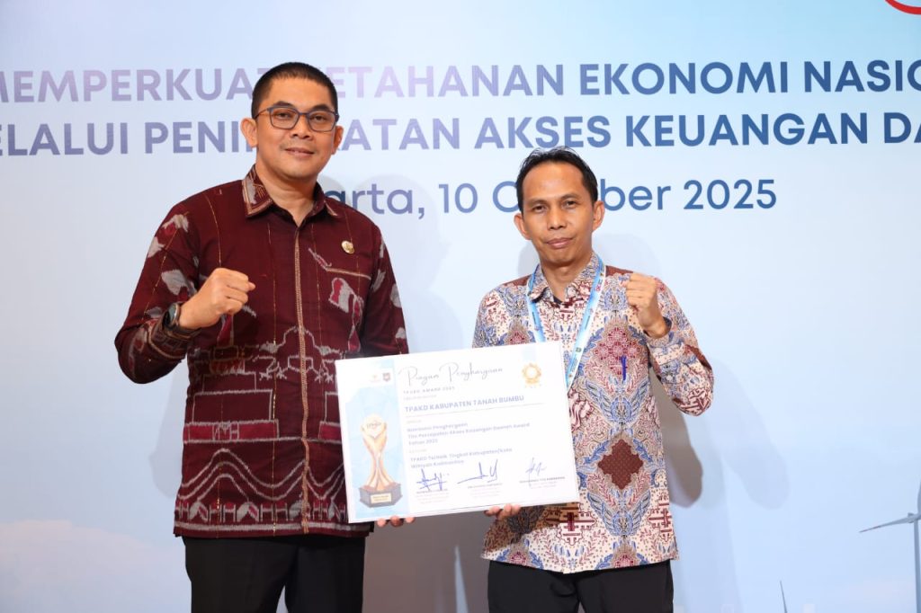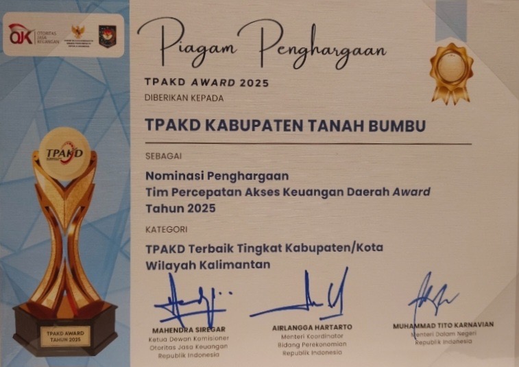 CBN Tanah Bumbu — Pemerintah Kabupaten Tanah Bumbu kembali menorehkan prestasi di tingkat nasional. Dalam ajang Rapat Koordinasi Nasional Tim Percepatan Akses Keuangan Daerah (Rakornas TPAKD) 2025, Pemkab Tanah Bumbu menerima Penghargaan TPAKD terbaik Tingkat Kabupaten/Kota Wilayah Kalimantan. Penghargaan diberikan atas komitmennya dalam memperluas inklusi keuangan di daerah.