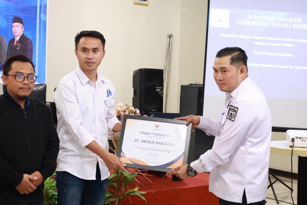 Sebagai bentuk apresiasi atas kontribusi dunia usaha, Pemerintah Kabupaten Tanah Bumbu melalui DPMPTSP menyerahkan Piagam Penghargaan Realisasi Investasi Tertinggi Tahun 2025 kepada dua perusahaan, yakni PT. Jhonlin Baratama untuk kategori Penanaman Modal Dalam Negeri (PMDN) dan PT. Kodeco AgroJaya Mandiri untuk kategori Penanaman Modal Asing (PMA).
