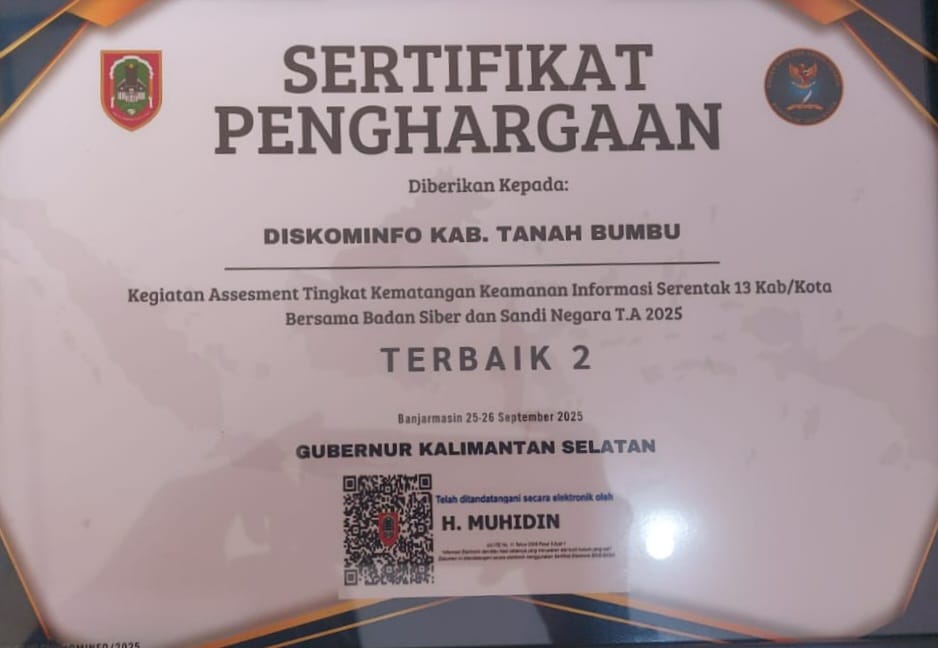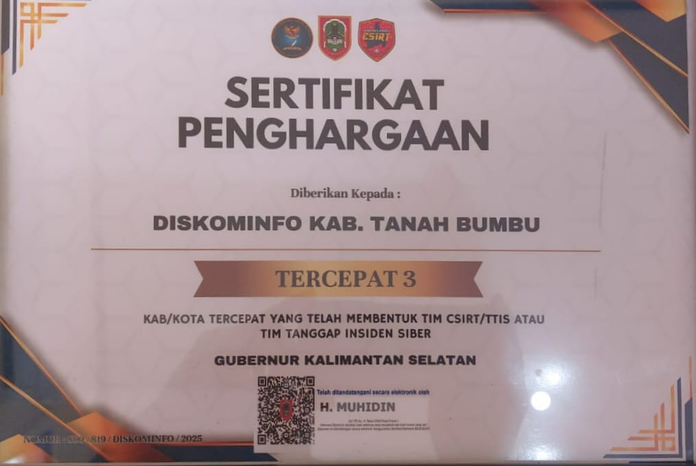 CBN Tanah Bumbu — Pemerintah Kabupaten Tanah Bumbu kembali menorehkan prestasi membanggakan di bidang keamanan informasi. Dalam ajang Rapat Kerja Daerah (Rakerda) Dinas Komunikasi dan Informatika se-Kalimantan Selatan, Tanah Bumbu menerima dua penghargaan sekaligus dari Badan Siber dan Sandi Negara (BSSN).