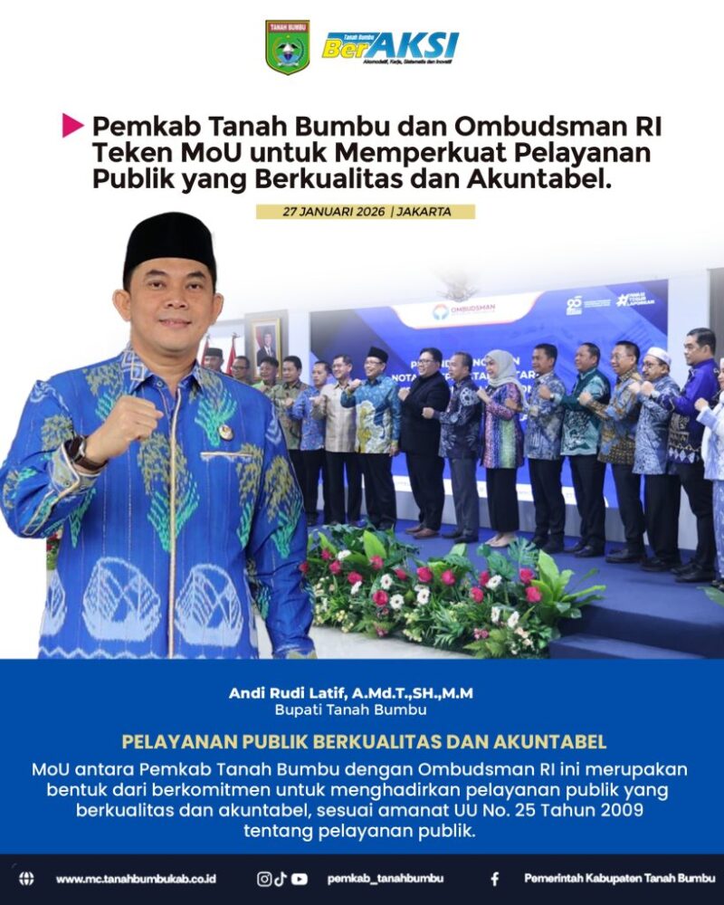 CBN Tanah Bumbu – Pemerintah Kabupaten Tanah Bumbu melakukan penandatanganan Naskah Kerja Sama (MoU) dengan Ombudsman Republik Indonesia, Selasa (27/1/2026) di Jakarta. Kerja sama ini menjadi wujud komitmen bersama dalam mewujudkan tata kelola pemerintahan yang bersih, transparan, serta bebas dari praktik maladministrasi.