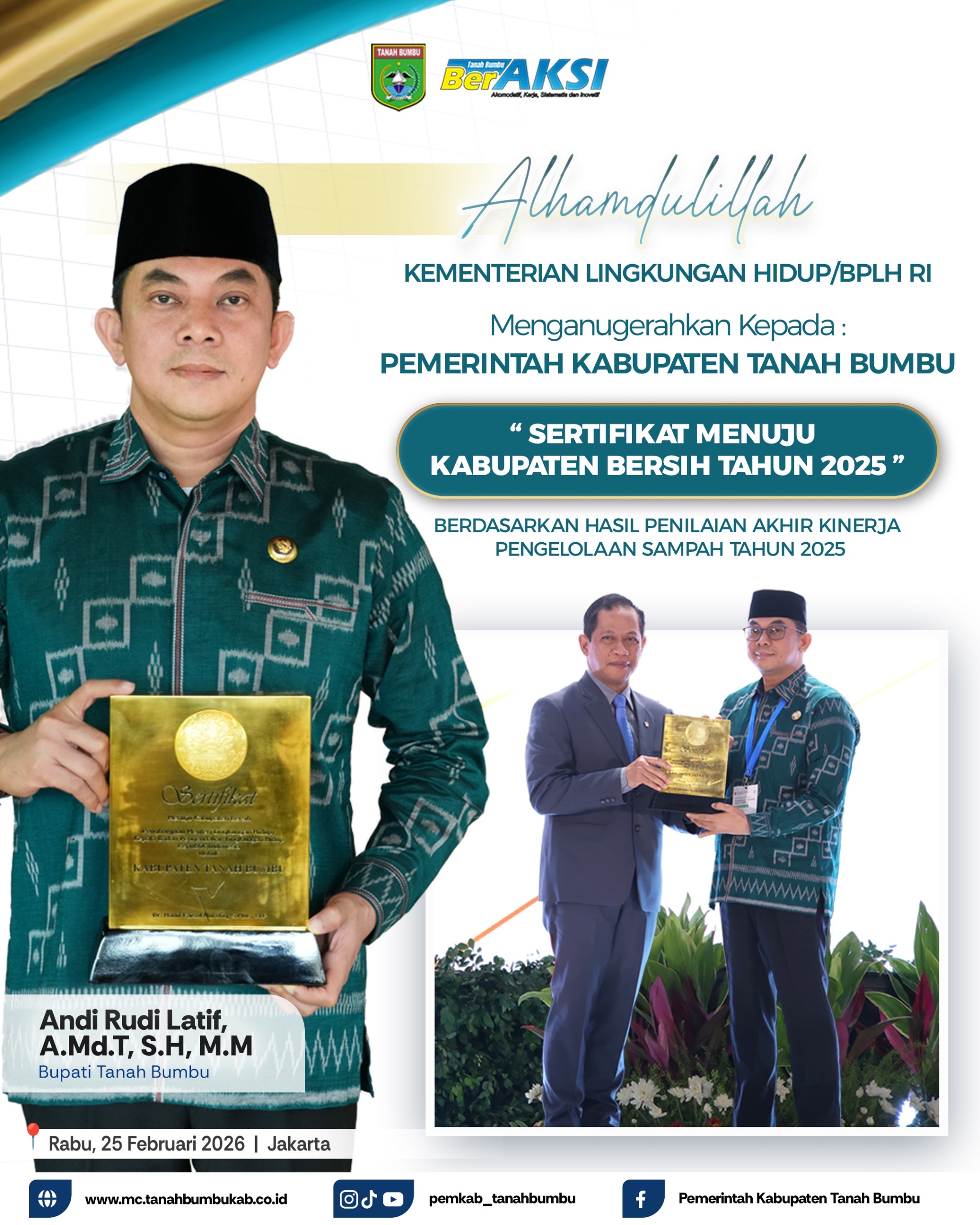 Sertifikat diserahkan langsung Menteri Lingkungan Hidup RI/Kepala Badan Pengendalian Lingkungan Hidup Republik Indonesia Hanif Faisol Nurofiq, kepada Bupati Tanah Bumbu Andi Rudi Latif, Kamis (25/2/2026) di Jakarta dalam Rakornas Pengelolaan Sampah 2026 yang dirangkai dengan peringatan Hari Peduli Sampah Nasional 2026.